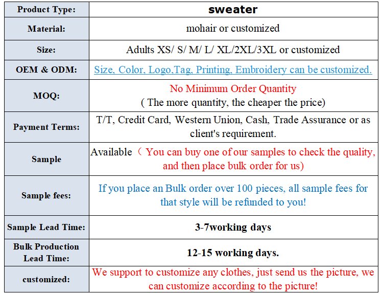 We can customize any sweater, you just need to send us your design file, or tell us your ideas, we can customize the sweater for you. After receiving your request, we will reply to your request in time and get all the details from you. Make sure the quality of the sweater is what you expect.